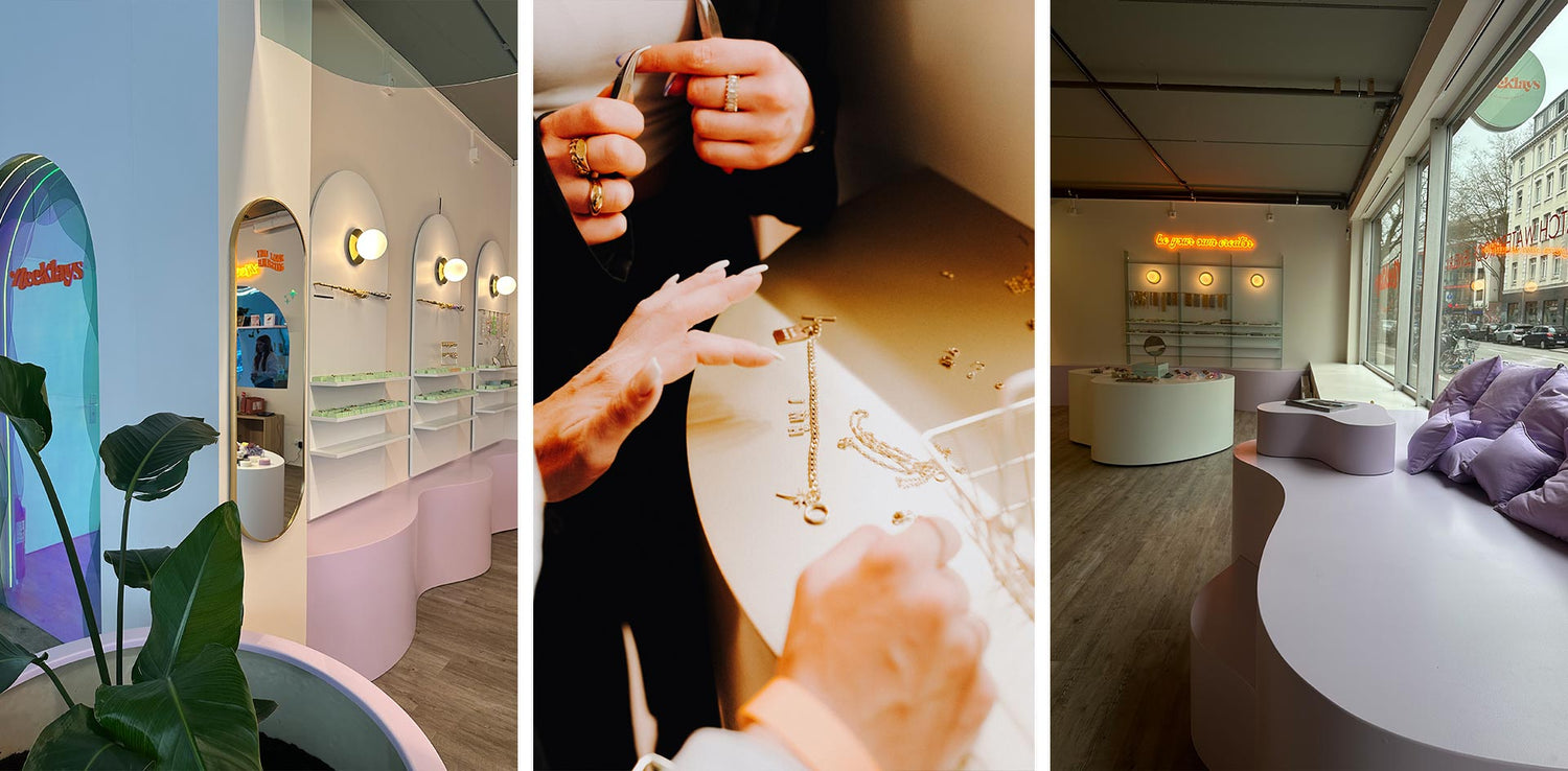 Kreiere deinen ganz persönlichen Look und Moment mit uns! Das Design des Stores haben wir selbst mit Hilfe von Donnerblitz design erstellt. Poppige Pastellfarben, Neonlichter und das Zusammenspiel von Licht und unseren glitzernden Schmuckstücken soll euch eine ganz besondere Atmosphäre geben. Das Highlight in Hamburg ist nicht nur unser Selfiebogen direkt am Eingang des Stores, sondern auch unsere großzügige Sitzecke, auf der ihr euch nach eurem Einkauf entspannen könnt 🙂