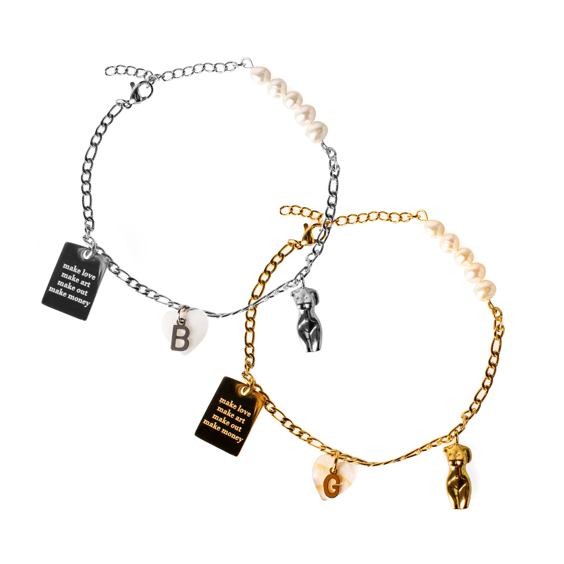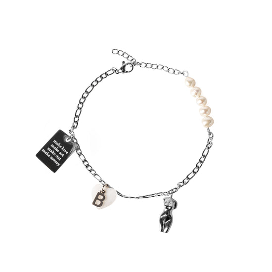 vergoldetes Armband „street“ aus Edelstahl mit handgefertigtem Perlen-inlay und verschiedenen Anhängern. Individuell personalisierbar mit deinem Wunschbuchstaben 🙂