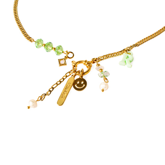 Kette Lock aus vergoldetem Edelstahl mit handgemachtem Einsatz und Anhängern aus Perlen und Ketten.