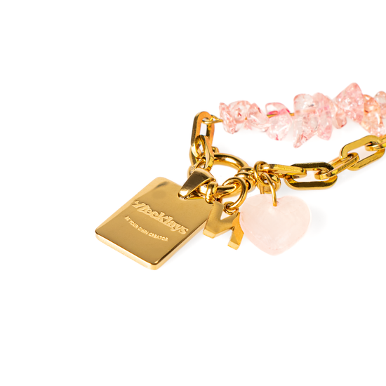 vergoldete Kette aus Edelstahl mit Inlay aus rosanen Steinen, Natursteinanhänger und personalisiertem Buchstaben.